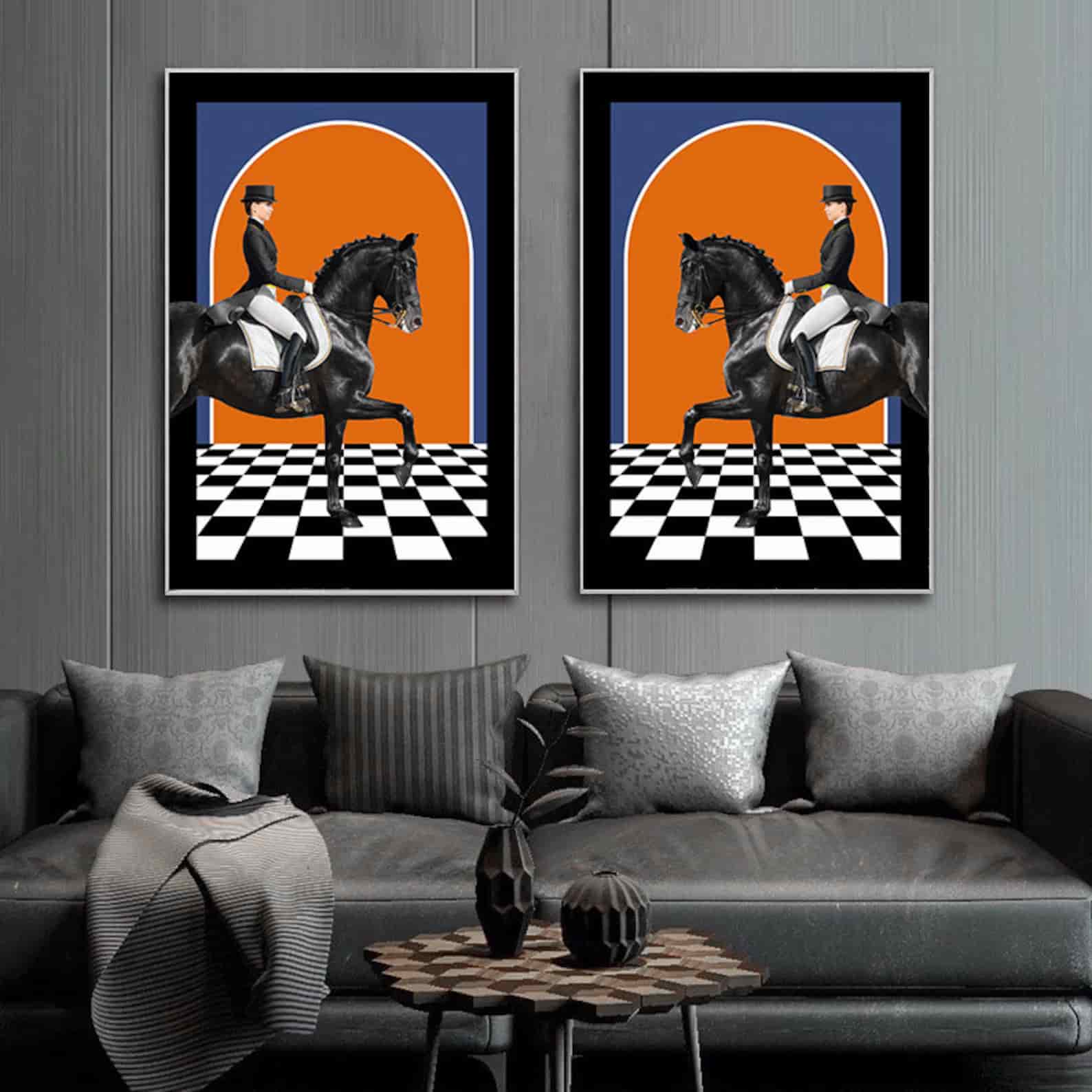 Blue Orange Femme Equitation Set de 2 Wall Art